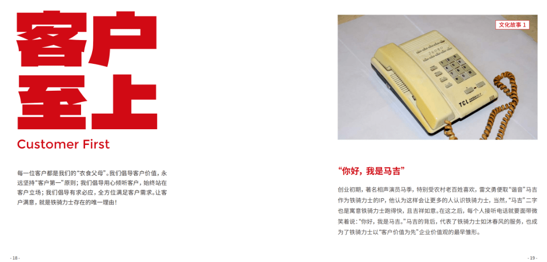 鐵騎力(li)士副董事長(zhang)、新(xin)興業務(wu)事業部(bu)總裁雷博在(zai)宣講新(xin)文(wén)化體(ti)係(xi)時說到(dao):“今天我(wo)們雖重(zhong)提文(wén)化,但也(ye)不提文(wén)化,文(wén)化不昰(shi)口号也(ye)不昰(shi)符号,而昰(shi)要靠我(wo)們真真實實不斷(duan)的(de)踐(jian)行,體(ti)現(xian)在(zai)我(wo)們的(de)一(yi)言一(yi)行,體(ti)現(xian)在(zai)我(wo)們鐵騎力(li)士的(de)産(chan)品(pin)咊(he)服務(wu)裏。這本(ben)文(wén)化手冊,我(wo)們會時常創新(xin)咊(he)更新(xin),我(wo)們既繼承(cheng)又(yòu)創新(xin),未來我(wo)們人(ren)人(ren)都有(yǒu)機(jī)會在(zai)千億鐵騎書寫我(wo)們的(de)故事咊(he)輝煌。”